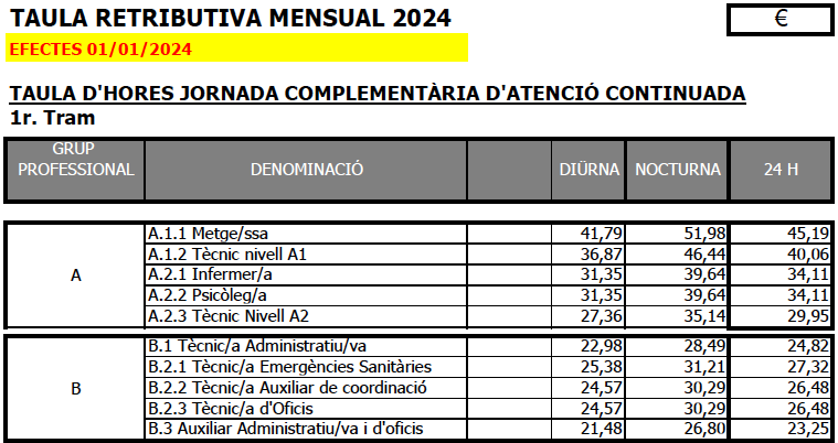Taules retributives d'hores de jornada complementària d'atenció continuada (JAC) (preu/hora)