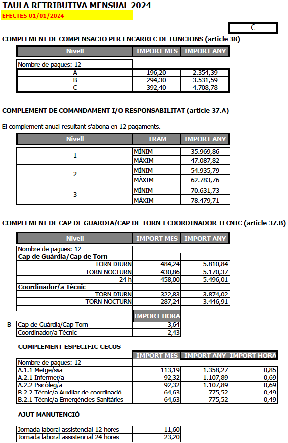 Imports complements de compensació per encàrrec de funcions, de comandament i/o responsabilitat, cap de guàrdia, cap de torn i coordinador tècnic, complement específic cecos i ajut manutenció