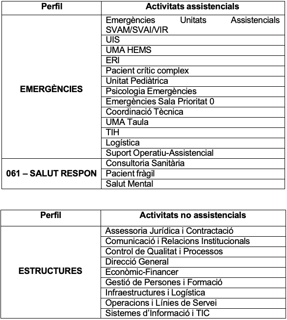 Perfil Emergències: Emergències Unitats Assistencials SVAM/SVAI/VIR, UIS, UMA HEMS, ERI, Pacient crític complex, Unitat Pediàtrica, Psicologia Emergències, Emergències Sala Prioritat 0, Coordinació Tècnica, UMA Taula, TIH, Logística, Suport Operatiu-Assistencial.